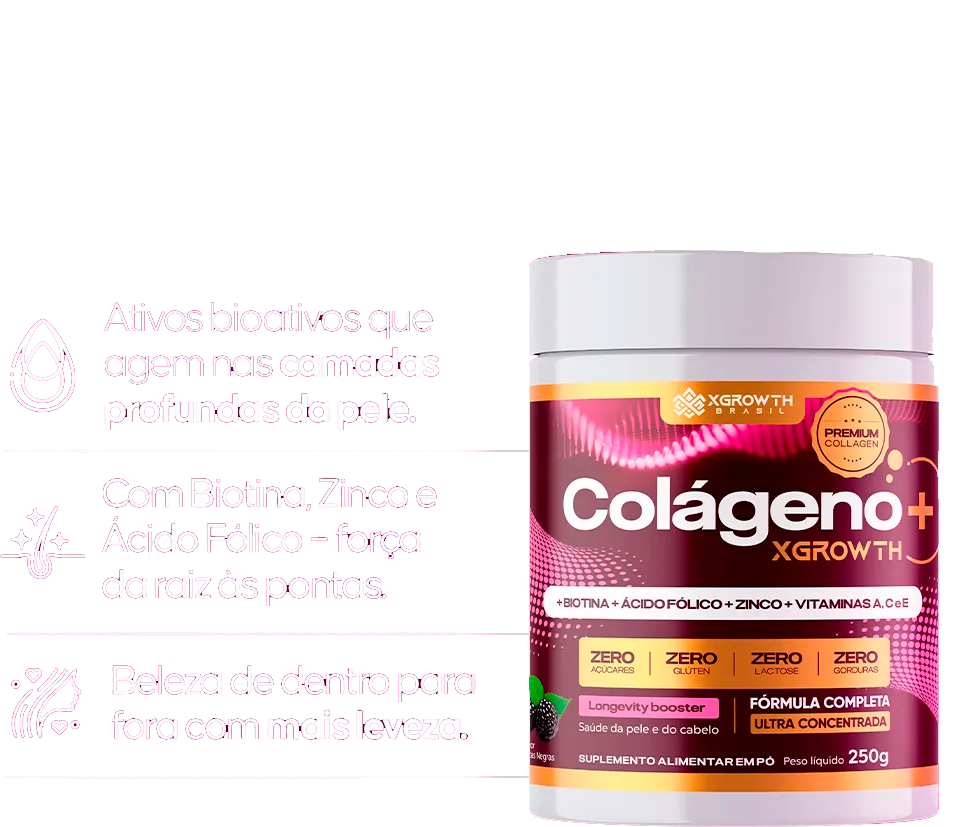 O Colágeno + XGrowth é um suplemento alimentar em pó com fórmula completa, desenvolvido especialmente para pessoas maiores de 19 anos que desejam complementar a rotina com nutrientes essenciais ao organismo.