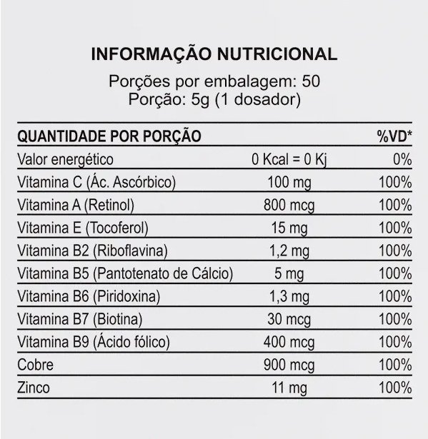 Vitamina B5 (Pantotenato de Cálcio): 5 mg100%